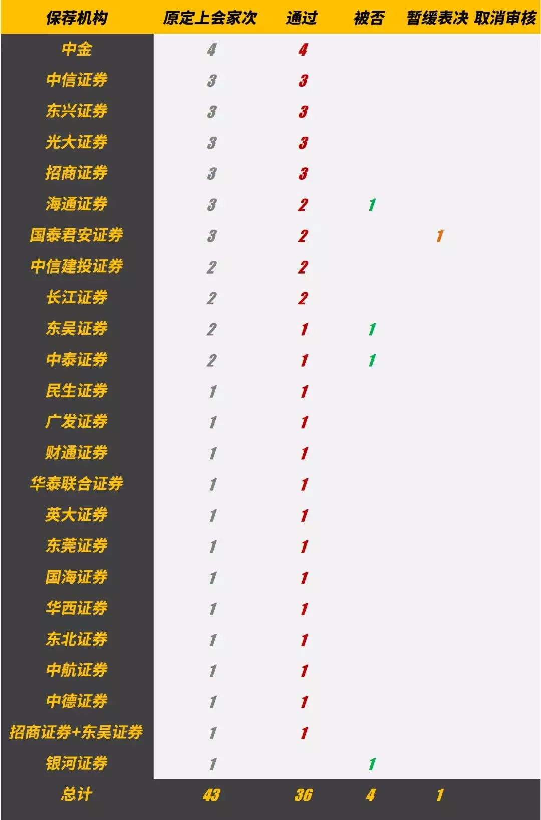 2019年前5个月,共42家发行人上会,38家获通过(含暂缓表决后获通过1家)+4家被否决。中金以4过4的成绩荣登过会榜首位;中信、东兴、光大、招商均以3过3的成绩紧随其后。
